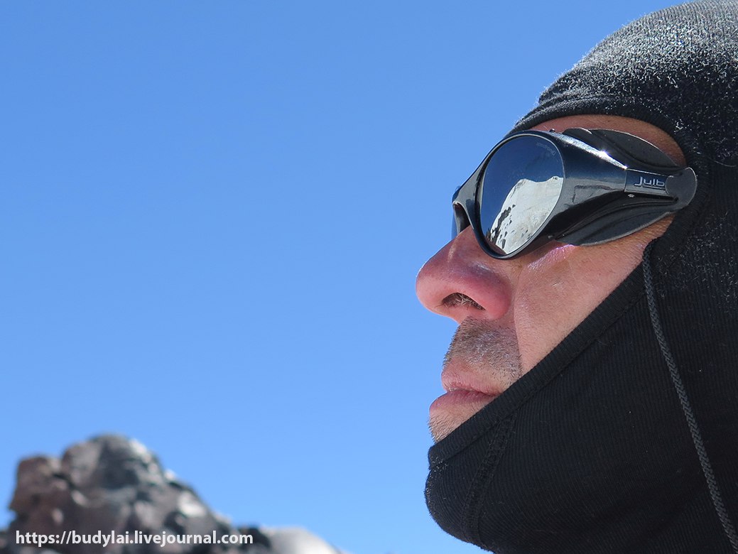 Вершины Эльбруса еще далеко и отражаются в стеклах очков...